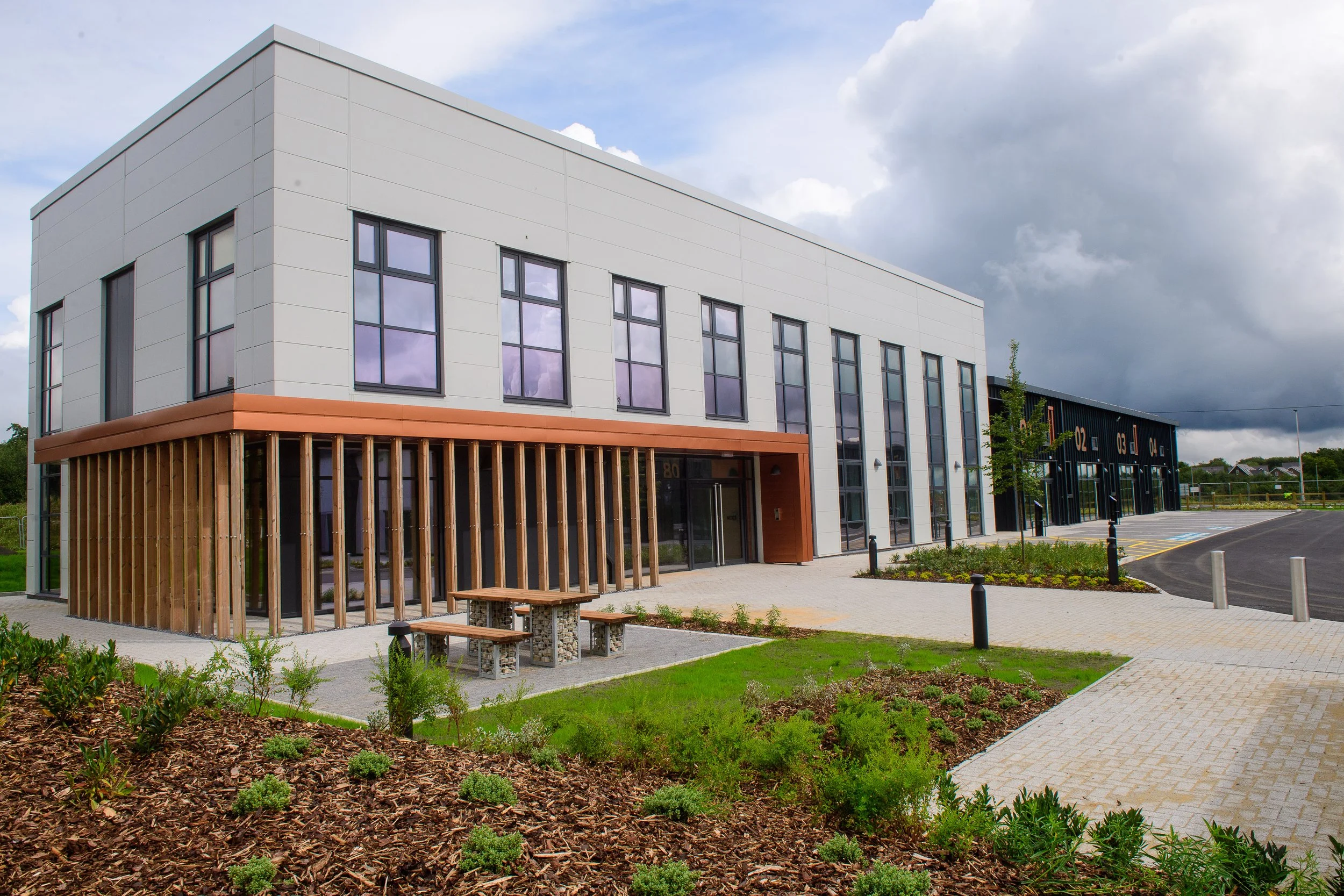 Comprising three buildings and offering a total of 38,000sqft, the development features a mix of modern office spaces and light industrial units. Each building has been designed in accordance with the RIBA 2030 Climate Challenge, targeting significant reductions in operational energy use, embodied carbon, and potable water consumption. Notably, the development will generate sufficient on-site renewable energy to meet all lighting and heating demands.